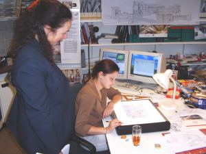 Architekt Bernhard Siepen bespricht mit Altpraktikanten Vladimir die neuen Figurenentwürfe |