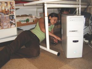 Praktikantinnen Karina und Eva schließen den für die Schautafelbearbeitung um 300 GigaByte aufgerüsteten Rechner an. |