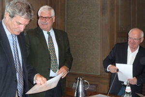 im linken Bild von links nach rechts: Dirigent Kazem Abdullah, Herrn Karl-Josef Oligs als Orchestersprecher und Dr. Meino Heyen. |