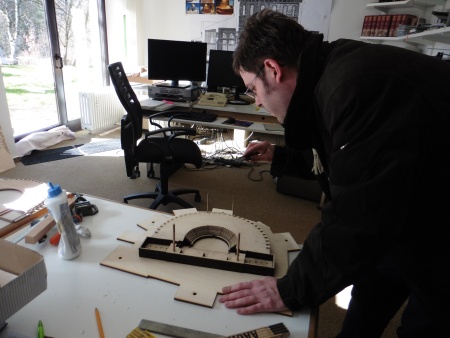 | Nun liegen die auf digitalen Datenangaben im Lasercutverfahren erstellten 2mm Birkensperrholzplatten vor und müssen passgenau aufgeschichtet und verklebt werden, was Michael Siepen ausführt. | |